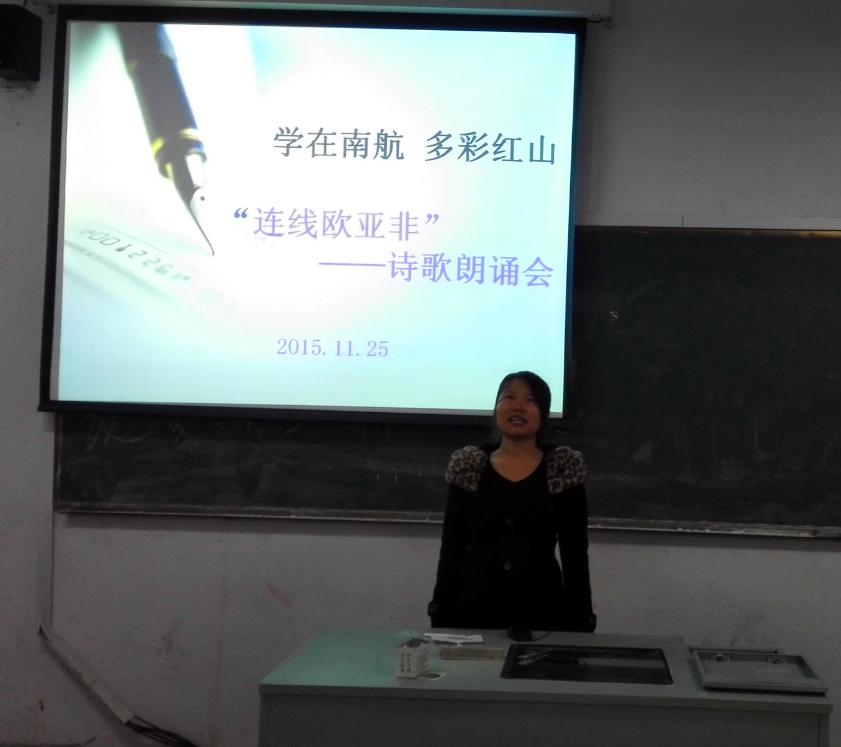 为给同学们提供一个英语交流平台,锻炼大家的英语口语能力,丰富红山校区的校园生活,院红山校区学生自律委员会、院科协驻红山校区办事处联合举办的“连线欧亚非”外语俱乐部活动在红山校区举行,本次活动分为诗歌会和外语交流会两个部分。