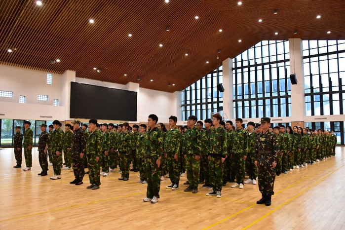 16日上午,军事拓展训练开营仪式在风雨操场举行。学院学生管理办公室主任邓国伟作训练动员。