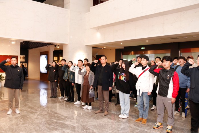 春雨沥沥,英魂长存。进入纪念馆,周恩来总理铜像挺拔矗立,生动展现出周总理坚定、沉着、机智、从容的革命家风度。在纪念馆讲解员的带领下,全体师生肃立在周总理铜像前,共同缅怀了敬爱的周总理伟大的革命精神,低头默哀、行鞠躬礼,李学东老师、宫雨婷同学代表大家敬献花篮。来到史料陈列馆大厅前,师生党员们举起右拳,面向党旗,在刘凯老师的带领下,重温了入党誓词。