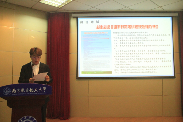 会议伊始,全体同学观看《诚信考试教育》宣传片,随后王帆同学结合《国家教育考试违规处理办法》(摘要)传达了学校和学院有关考试和考场相关规章制度,提醒同学们要严格遵守考风考纪,并结合实际案例对考试违纪的严重后果进行了讲解。
