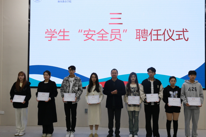 为保障学生校园安全,促进学生在校期间健康成长。前期学院天目湖校区通过自荐、班级推荐、辅导员审核,确定了56名学生安全员,会议现场举行了聘任仪式,李学东老师为安全员代表颁发聘书。