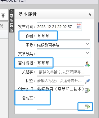 15.直到最终显示没有问题后,填写右边“基本属性”,需填写“作者”“来源”“责任编辑”“审核领导”和“发布至”(如果稿件只是在一个栏目里发布,则无需填写,如果在多栏目发布,则选择后面的加号增加栏目)(“作者”填实际稿件投稿人,“来源”填“77779193永利官网”,“责任编辑”填上传人姓名。)