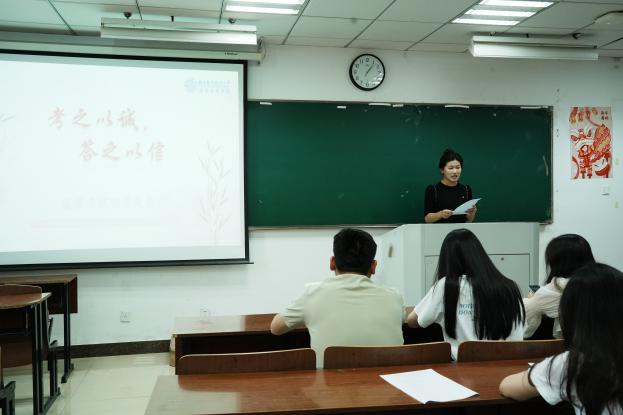 戴安娜老师作寄语讲话。她希望同学们牢固树立底线意识,在考试中严格遵守考试诚信原则,以实际行动践行诚实守信的品格,做到诚信做人、诚信考试。她还结合往年违纪案例,提醒同学们要引以为戒,警钟长鸣,遵规守纪,决不能有侥幸心理。临近考试期间要注意作息,希望同学们认真复习,诚信应考,用辛勤汗水和真才实学换取优异的成绩。
