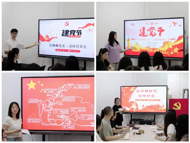 在红色故事分享环节,学生党员徐普淳同志分享了“忆峥嵘党史,话时代荣光”的主题演讲,分别从建党节的由来、回望党的奋斗历程、伟大建党精神的内涵和如何砥砺奋进践初心四个方面进行讲述,带领大家重温红色历史、汲取精神力量,鼓舞大家奋楫扬帆、砥砺前行。随后,学生党员张伊铭同志带领大家学习了“红船精神”,回顾了波澜壮阔的峥嵘党史征程。同志们表示,要不断赋予“红船精神”新的时代内涵,让其绽放新的时代光芒,为奋进新征程提供强大精神动力。学生党员徐晓楠同志带着大家感悟“长征精神”传承红色基因。“长征精神”的学习激励着师生不忘初心走好新时代长征路,发扬自强不息、坚韧不拔的奋斗精神。学生党员王文静同志带领大家观看学习了《血战长津湖》,把大家带回1950年战火纷飞的抗美援朝战场,穿越时空去感悟新中国发展的艰难历程和人民志愿军的伟大奉献精神。