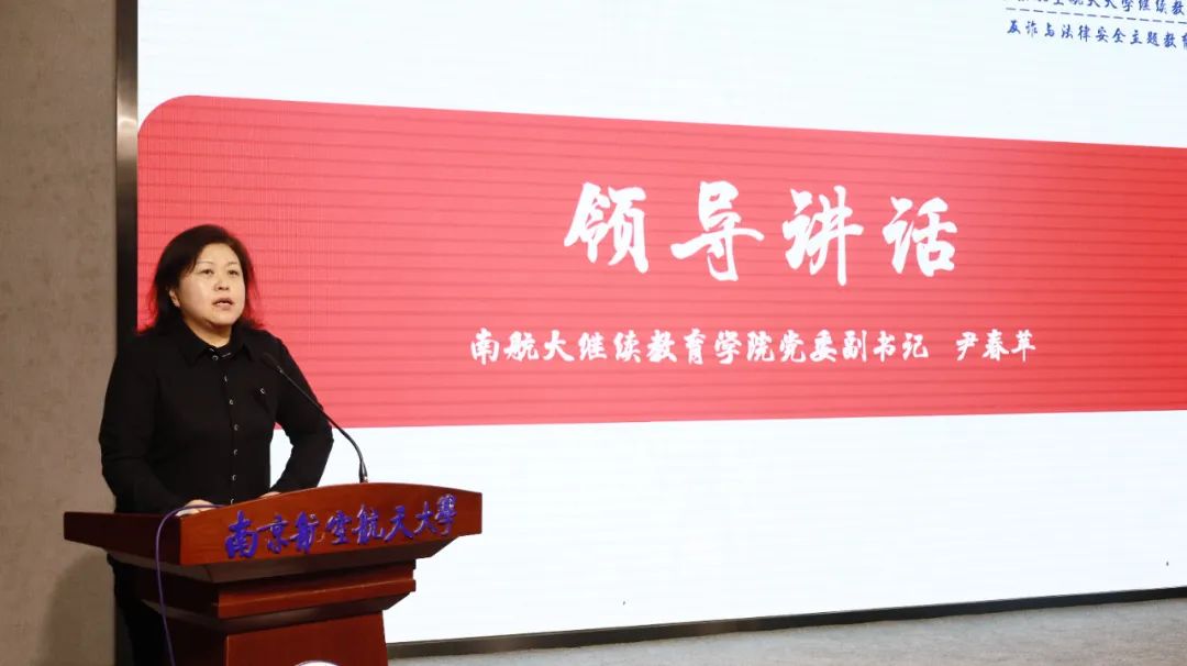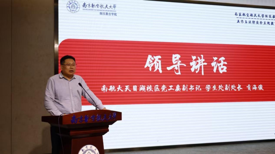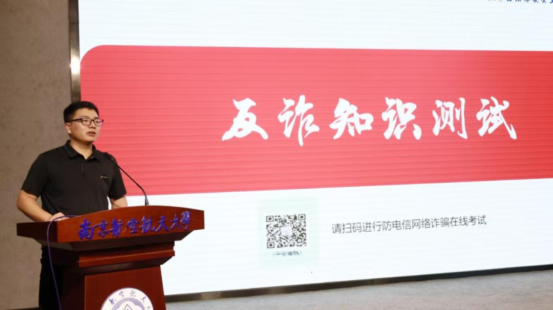 天目湖校区党工委副书记、学生处副处长贡海俊发表讲话。他强调,反诈不仅是一项技术活,更是一场心理战。在校师生需要不断提高防范意识,进一步筑牢学校防范电信网络诈骗的坚固屏障,守护校园安全。师生也需要充分了解法律、敬畏法律、遵守法律,有效地运用法律手段来维护自己的合法权益。
