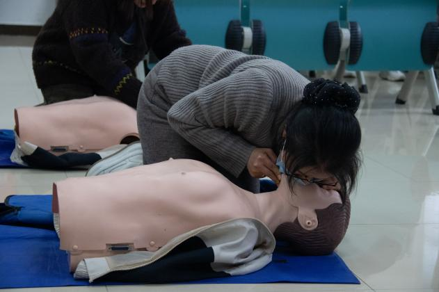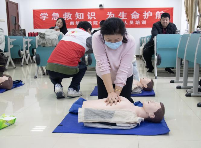 实操练习环节,红十字会老师在模拟教具上的心肺复苏示范精准无误,老师们分组反复操练,逐渐从生疏走向熟练。